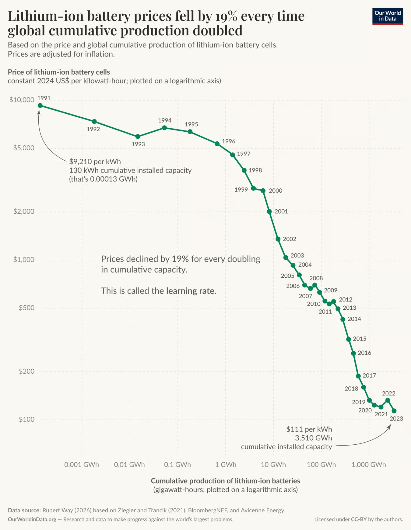 O gráfico abaixo mostra a queda nos preços das células de bateria de íon-lítio desde 1991. A escala é logarítmica. O preço caiu mais de 99%. Em 1991, as baterias de íon-lítio custavam cerca de US$ 9.200 por quilowatt-hora — 33 anos depois, custam apenas US$ 78.